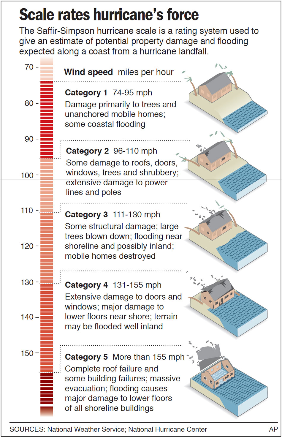 The Saffir-Simpson Hurricane Wind Scale is a 1 to 5 categorization based on the hurricane's intensity at the indicated time. The scale – originally developed by wind engineer Herb Saffir and meteorologist Bob Simpson – has been an excellent tool for alerting the public about the possible impacts of various intensity hurricanes1. The scale provides examples of the type of damage and impacts in the United States associated with winds of the indicated intensity. In general, damage rises by about a factor of four for every category increase2. The maximum sustained surface wind speed (peak 1-minute wind at the standard meteorological observation height of 10 m [33 ft] over unobstructed exposure) associated with the cyclone is the determining factor in the scale. (Note that sustained winds can be stronger in hilly or mountainous terrain – such as the over the Appalachians or over much of Puerto Rico - compared with that experienced over flat terrain3.) The historical examples provided in each of the categories correspond with the observed or estimated maximum wind speeds from the hurricane experienced at the location indicated. These do not necessarily correspond with the peak intensity reached by the system during its lifetime. It is also important to note that peak 1-minute winds in hurricane are believed to diminish by one category within a short distance, perhaps a kilometer [~ half a mile] of the coastline4. For example, Hurricane Wilma made landfall in 2005 in southwest Florida as a Category 3 hurricane. Even though this hurricane only took four hours to traverse the peninsula, the winds experienced by most Miami-Dade, Broward, and Palm Beach County communities were Category 1 to Category 2 conditions. However, exceptions to this generalization are certainly possible.